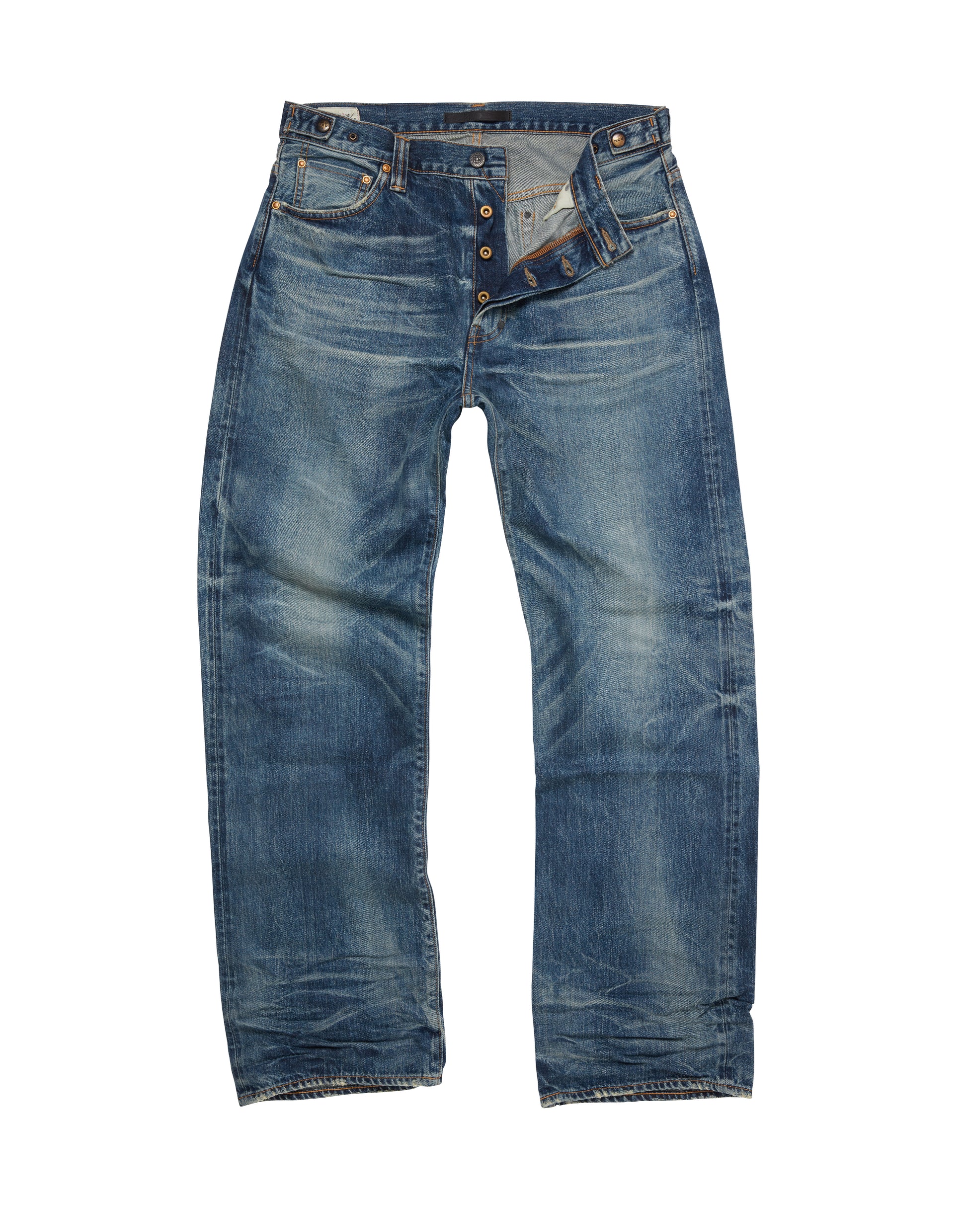 This mid-blue handcrafted wash with an authentically aged and 3D finish gives it a well-worn, vintage feel. The embroidered gold circle on the wearer’s thigh is a mid 20th century vintage workwear detail, but it is a nod to Japan’s ‘circle of the sun’, symbolised in red on the Japanese flag. For MCU, it represents 100% made in Japan artisanal jean.